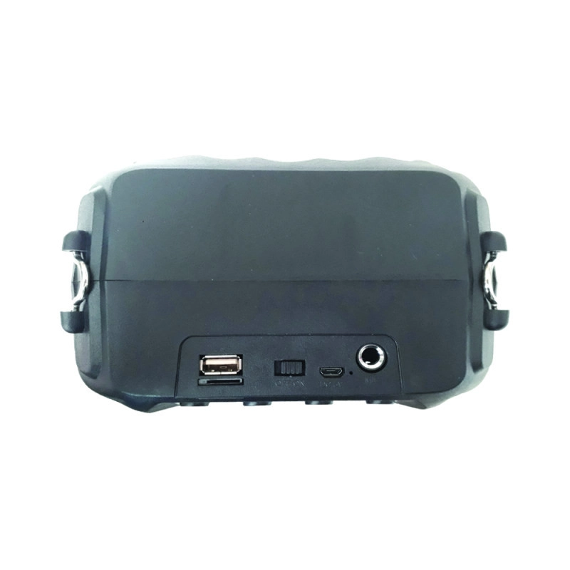 دو پورت های USB/TF Card قابلیت پشتیبانی و پخش فایل های آهنگ با فرمت FAT32 با حداکثر سایز 32 گیگ وقابلیت پخش برنامه های رادیویی با گیرنده موج FM و فرکانس های مابین 87.5 هرتز تا 108 مگاهرتز که برای اسکن کانال ها میتوان از دو کلید عقب و جلو کردن ترک ها بهره ببرید.همانطور که در تصاویر مشاهده می کنید در جلو بدنه بلندگو 4 کلید مولتی مدیا جهت مدیریت کنترل صدا و موسیقی و … که می تواند آهنگ ها را براحتی کنترل کرد. این دکمه ها شامل کلید مود با حرف M مشخص شده و جهت انتخاب انواع اتصال (BT/USB/TF/FM)، دو دکمه برای کم/ زیاد کردن ولوم صدا و عقب و جلو کردن ترک ها و یک کلید Play/Pause جهت پخش و مکث موزیک ها کار گذاری شده است.